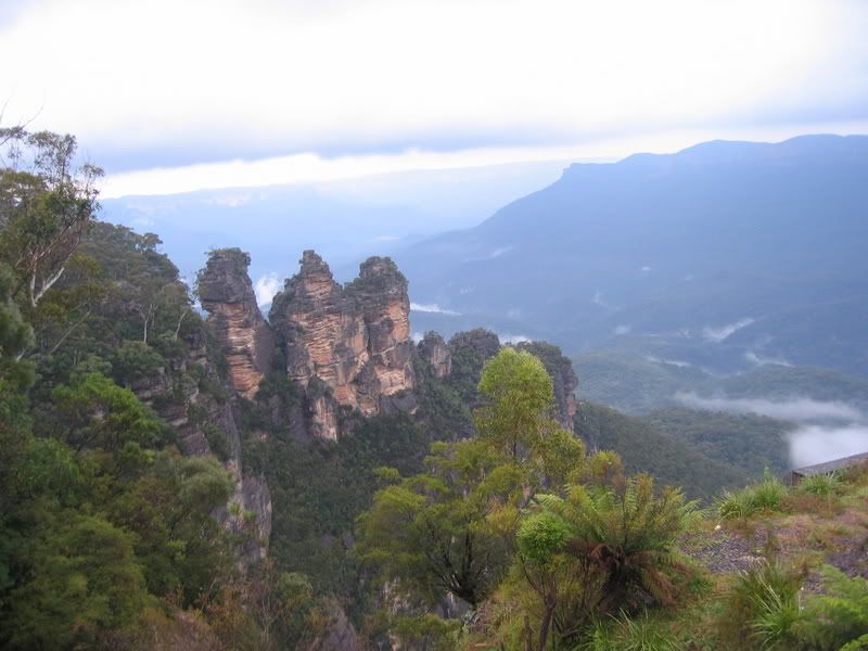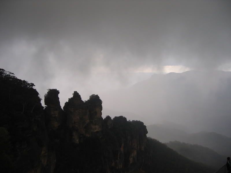 made our way to check into YHA backpackers... ate cheap dominos before walking to 3 sisters. along the way... saw bowerbird gallery and thought it was a place to see birds. but it was some art gallery with lotsa great pieces. had to run to 3 sisters... as the thunder came. probably due to the high altitudes... weather changes were extreme. a while later... it got this dark. then came the mini hail... like tiny ice balls raining on us. so everyone there took cover in the souvenir shop. after some time... the sky cleared... & it was all nice again.