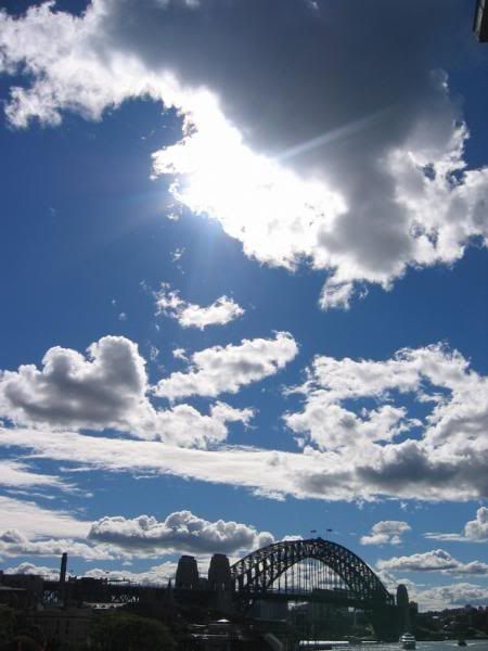 headed to opera house and i tell u... the wind was the coldest ever! so strong that it was difficult to walk! the clouds there are especially nice... & i couldn't stop taking shots of the sun. see the rays... more to come later. hahaha didn't climb the bridge coz its damn expensive... couldn't go in opera house too. so juz walked around and enjoy being blown by the wind...