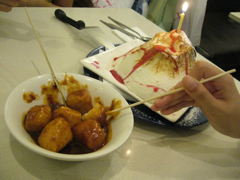 the mountain-like thingy is actually egg white with ice cream inside.. really nice! the egg white is like eating foam... very special. the chilli fishballs were so spicy! and that's some doufu ginseng pie. hmm... some sweet soup inside with a unique taste.. but didn't realli like that though. kekeke