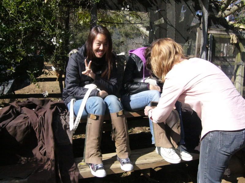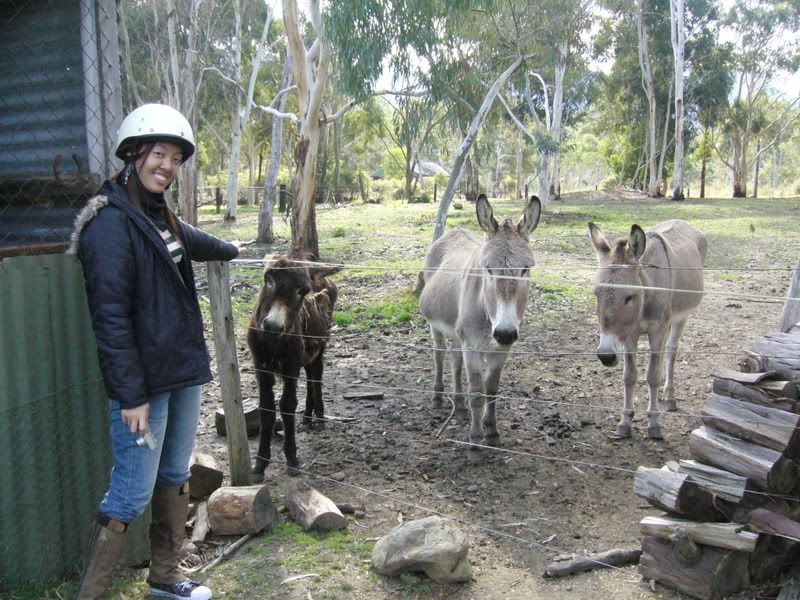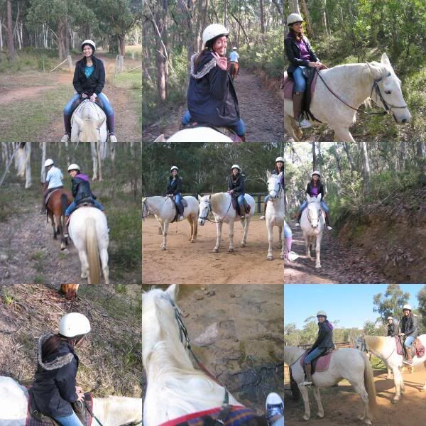 then stopped over at blackheath for sandwich lunch... before travelling to megalong for our 1.5hr horse ride! it was a horse farm... with a parrot who couldn't stop saying "hello" each time we walked near. got our "leggings" and helmets put on, awaiting our white horses. it was a damn farnie ride. starting off was alright... but many hilarious things happened along the way. like horse like rider... especially neo's. hahaha her horse kept eating along the way. leong's was quite naughty and the first to "go toilet"... like an open tap. mine was quite steady... juz following ahead and shit-ing once. both rider and horses exercised... according to the trainer. so true... coz our legs ached a little after that.