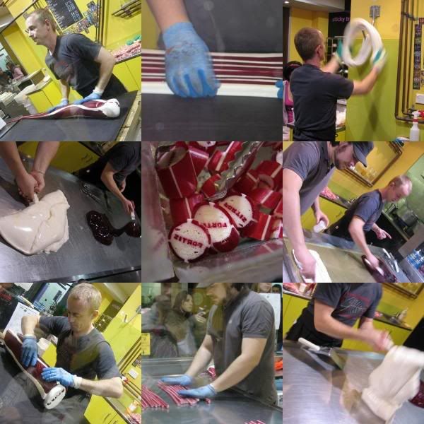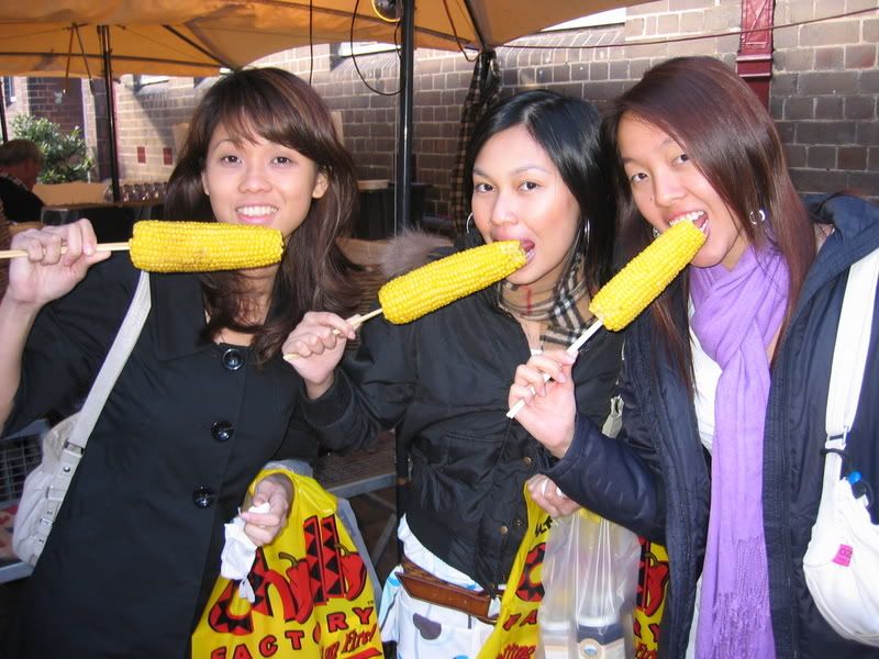 sunday.. we all wore new clothes! decided to dress up coz going to opera house (outside) and habour bridge. had blueberry bagel with cream cheeze for breakfast. i'm so hooked! u can't believe how nice the combi is... sweet bagel with the cheeze..oOoooOooo i realli miss it! anywayz... took a bus and continued in a double-decker train at epping station to central. a little more walk... and its Rocks market! a huge tentage with many many stalls. accessories, art, food, choc, honey, nuts... so many stuff! had yummilicous corn.. so sweet & salty~ and then choc coated strawberries. so sweet la... the strawberries. went to watch sweet-making process which took almost an hr. the nice shop owner gave us each a big heart-lolli... FOC! see... i told u aussies are nice pple.